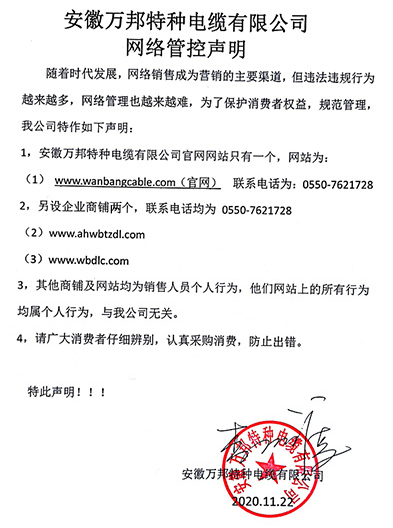 鄭重聲明:安徽萬邦特種電纜有限公司官方網站為:www_wanbangcable_com.freedownloads.cn,除此之外無任何子網站或合作網站,其余均為假冒偽劣。電話:0550-7621728 13485756353 地 址:安徽省天長市滁州高新技術產業開發區經四路29號